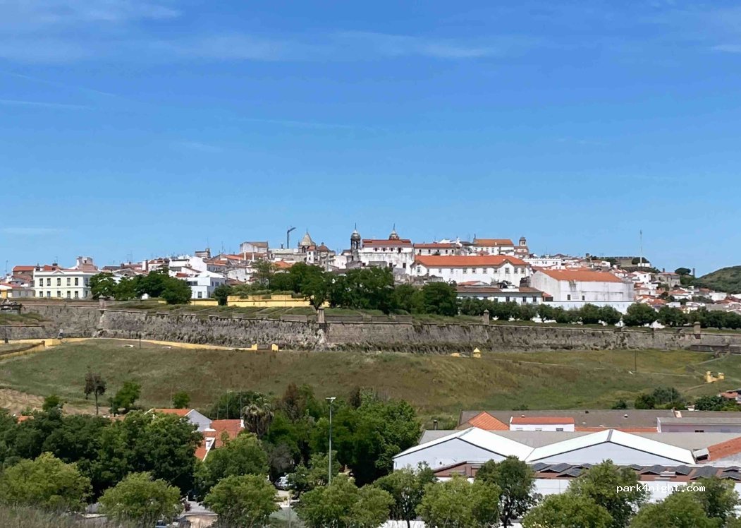 Free public flat P at fortress inlet (also military museum) with wide view to Elvas town historic center and walls. Adequate walking distance to supermarket (Lidl) and town center. Nice panorama over town at sunset. Also by night.