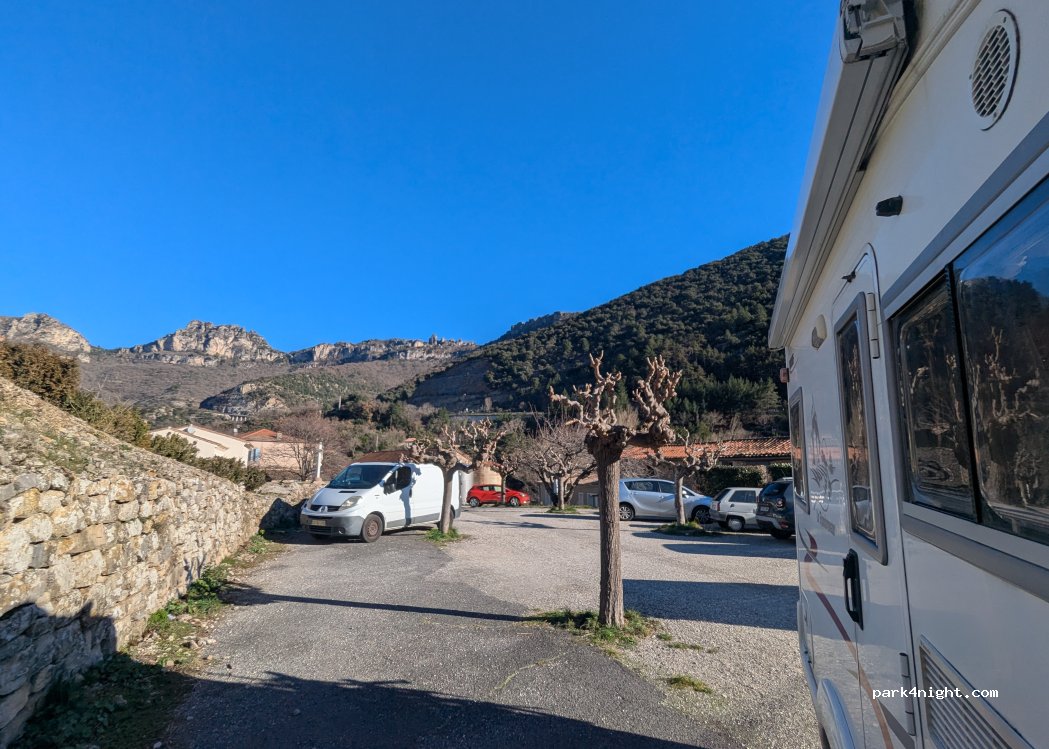 Parking agréable à proximité immédiate de la mairie de Pégairolles de l'Escalette. Toilettes publiques bien entretenues et ouvertes la nuit à proximité. Comme indiqué, inadapté pour les véhicules de plus de 7 mètres. Attention, sortie en marche arrière via un accès pas très large.