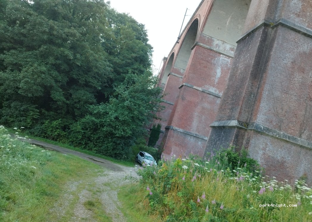 Bel endroit sans installations. Certainement recommandé. Camper sous les hautes arches du viaduc est amusant d'une part, mais présente quelques inconvénients. Il résonne, donc la fermeture d'une porte résonne pendant un certain temps. Et un conseil important : quand il pleut, ne restez pas sous la gouttière. L'eau claquait fort sur le toit de notre camping-car.