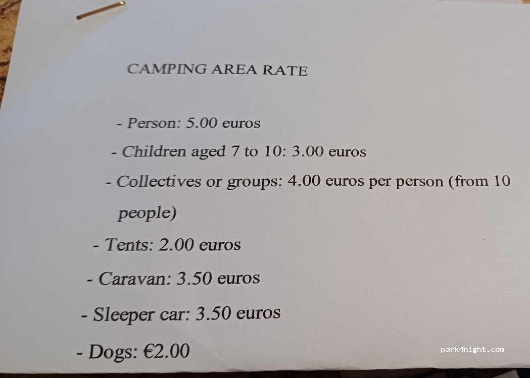 11€ una furgoneta y dos adultos. Buen lugar para pernoctar con lavabos, duchas, para lavar los platos y llenar agua de la furgoneta. Para repetir. Todo estaba muy limpio.