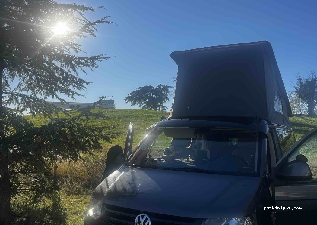 Parfait pour une nuit. Arrivée après la tombée de la nuit le 23/09. Il y avait un CC. Nuit très calme. Un peu de circulation à partir de 8:00 le matin, pas très gênant. Je suis repartie à 9:00