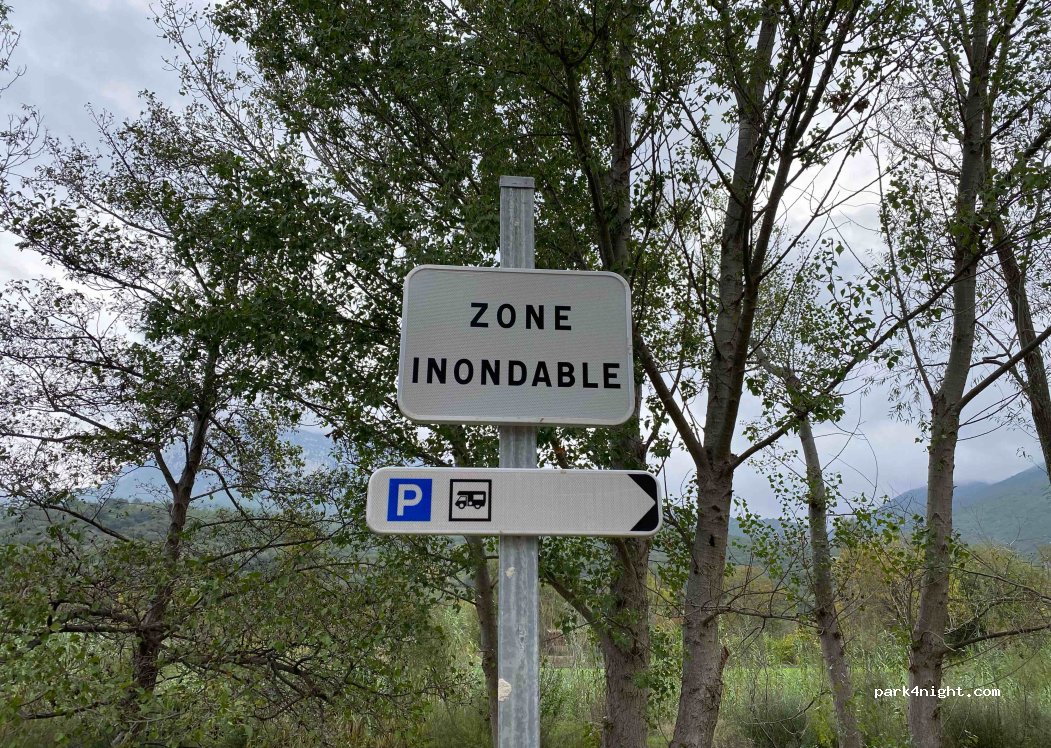 grande parking le long de la rivière , emplacement assez large entre les lauriers rose . manque une borne de vidange et remplissage .Merci a la municipalité pour cet aire gratuite