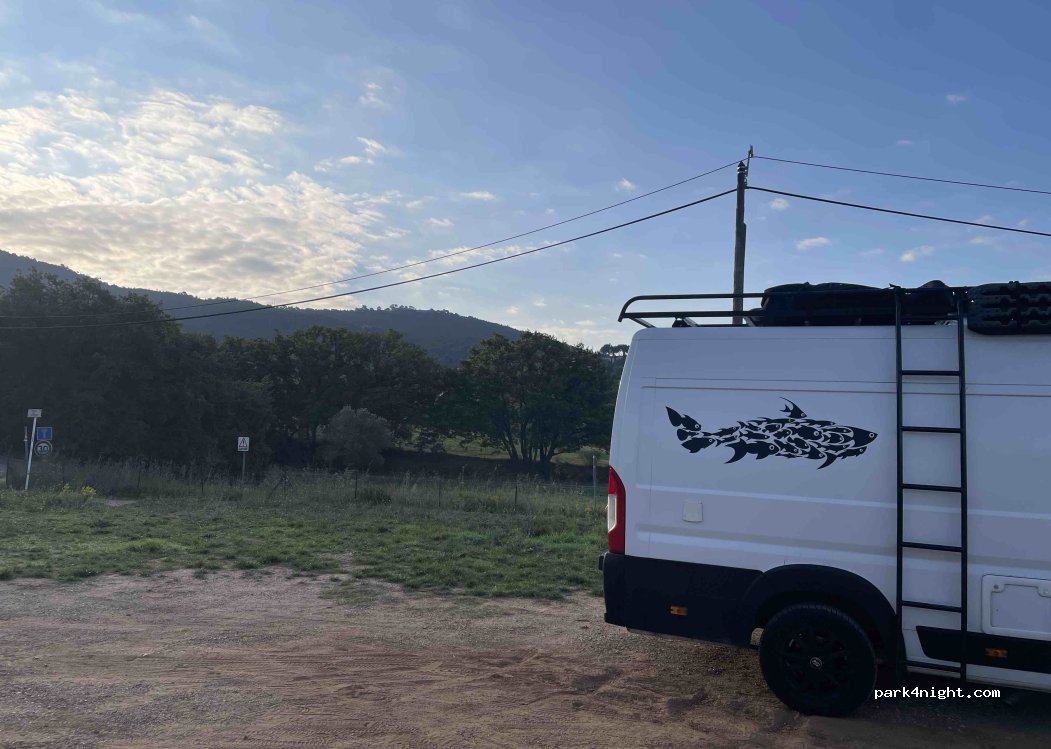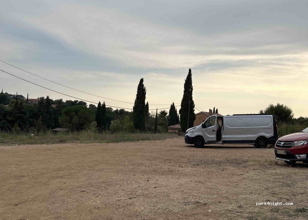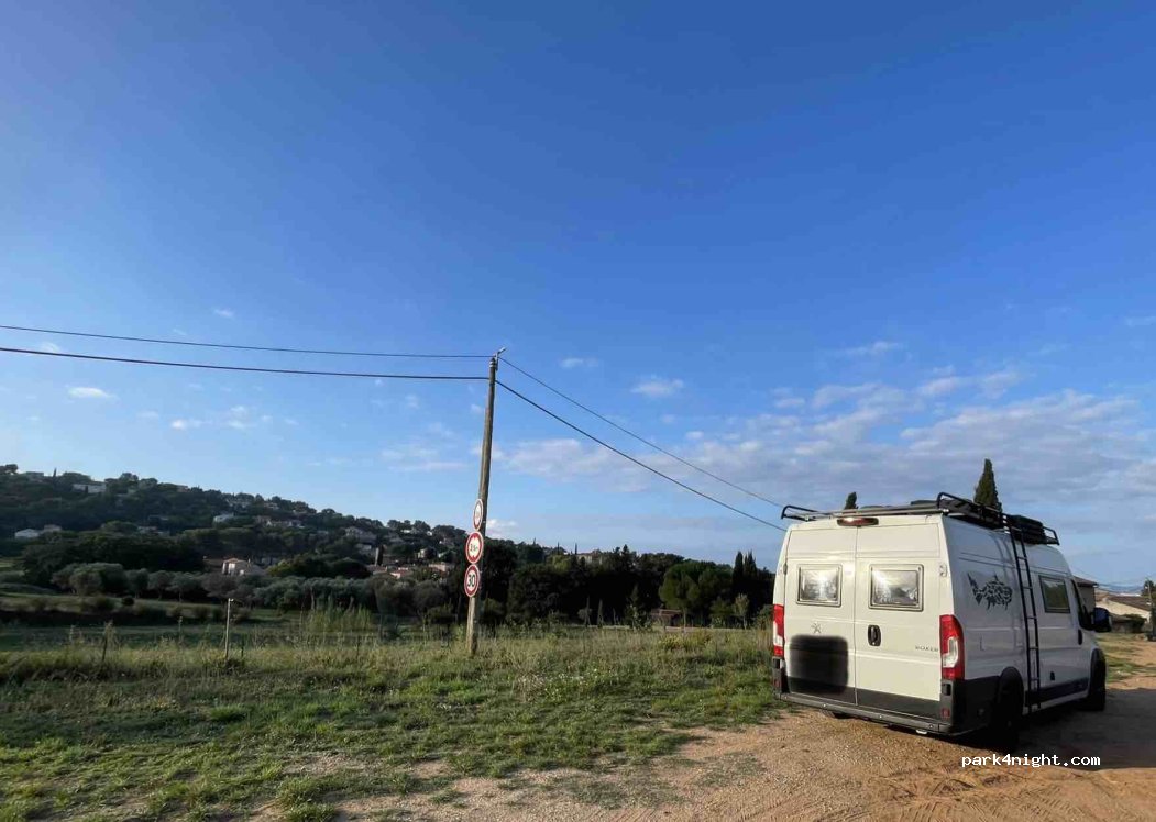 Lovely quiet spot just outside the town. 10 mins walk to the beach. Few bars, boulangerie and a mini market by the beach. A few cars pass by in the evening and from 7.30 but not enough to disturb. Lovely view over fields. One other van came later in the evening. As per previous comment, it is a minute or two further down the road than indicated on the map here.