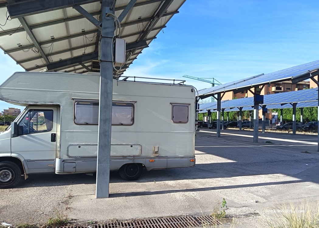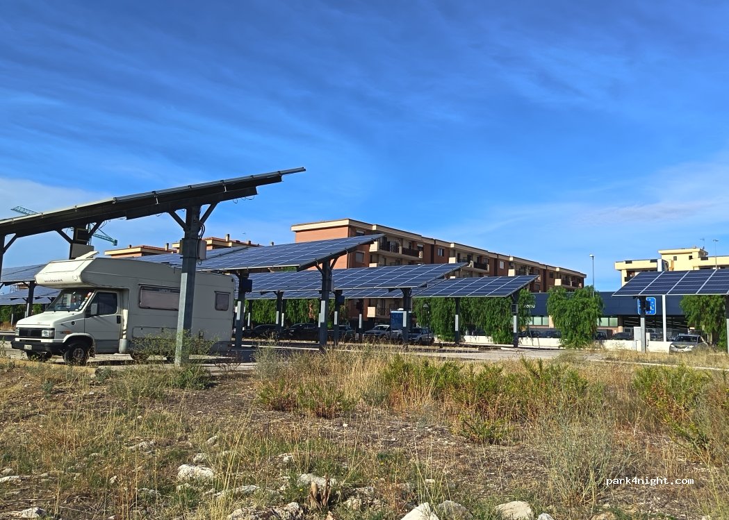 Sosta camper gratuita sotto i pannelli solari, proprio davanti all’Eurospin. A piedi si raggiunge il centro in circa 20 minuti. Abbiamo parcheggiato la mattina, trascorso la notte, senza alcun problema. La strada è trafficata durante il giorno, ma la sera si calma e si riesce a riposare. L’area non è particolarmente pulita, ma per una sosta comoda e senza pretese va benissimo.