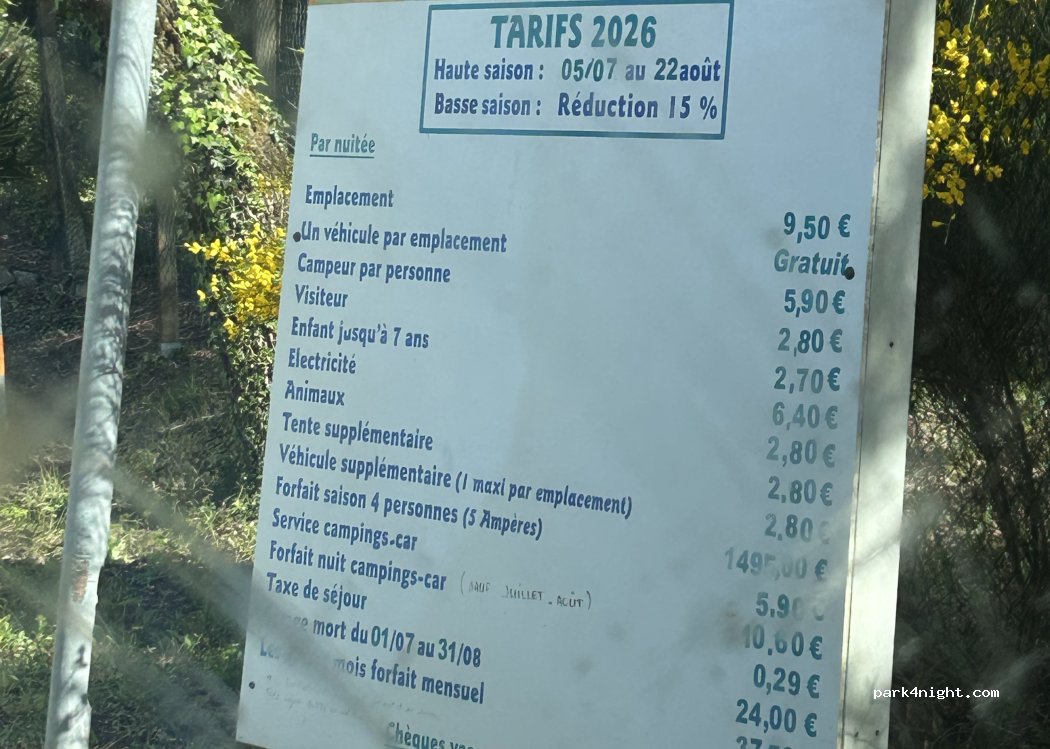 Passé 1 nuit, en plein mois d'août 23 € combi, 2 adultes, 1 enfant, électricité. Calme et ombragé, accueillant, sanitaires pas neufs mais propre !