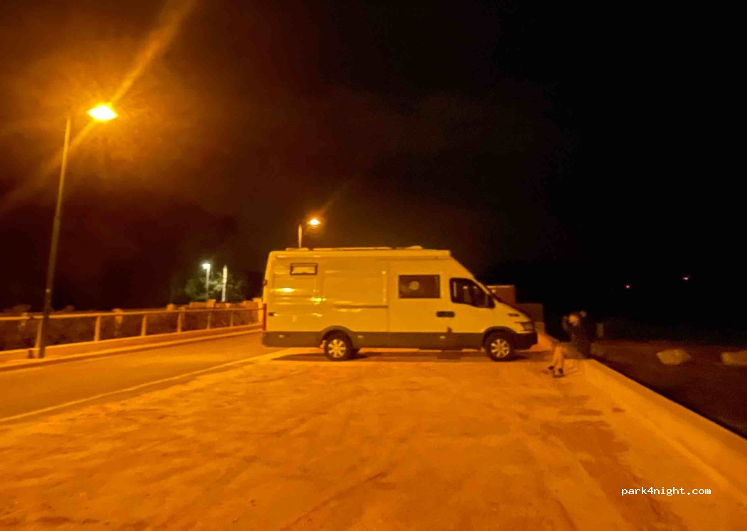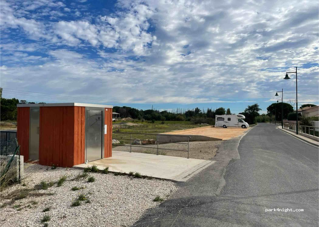 Parking juste ce qu’il faut pour une/deux nuits devant les installations sportives où nous avons passé une nuit tranquille. Toilettes publiques sur le site avec ouverture et fermeture automatique (22h00-06h00) mais pendant notre présence, elles ont fermé à 18h30 et à 07h00, elles étaient toujours fermées. Urinoir et robinet d’eau à l’arrière, poubelles à proximité.