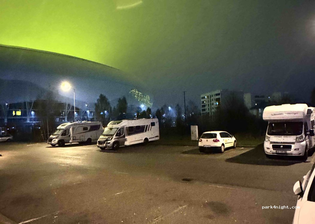 Wir haben hier eine sehr ruhige Nacht verbracht. Wir haben dort genau gestanden, wo die Koordinaten hinführen, siehe Fotos. Der Platz ist beleuchtet, kein Schatten. Die Polizei macht des öftern hier Pause und und Fahrschulen üben am Tag, das stört nicht weiter. Bei Veranstaltungen im Stadion oder der Halle dürfte es voll werden.