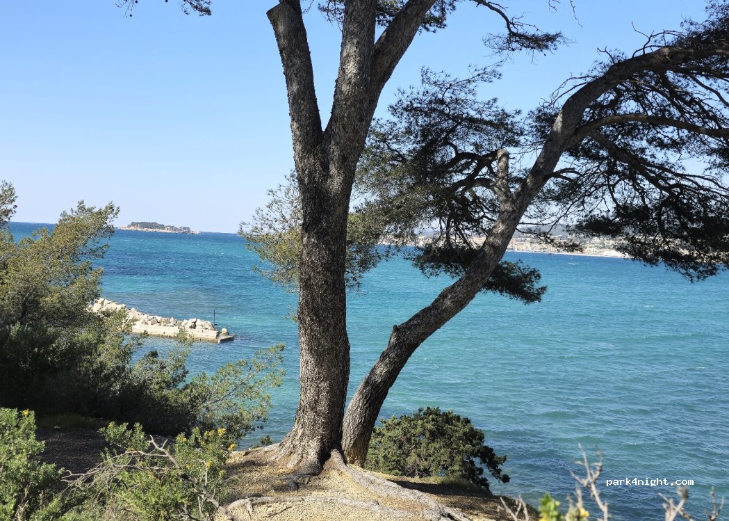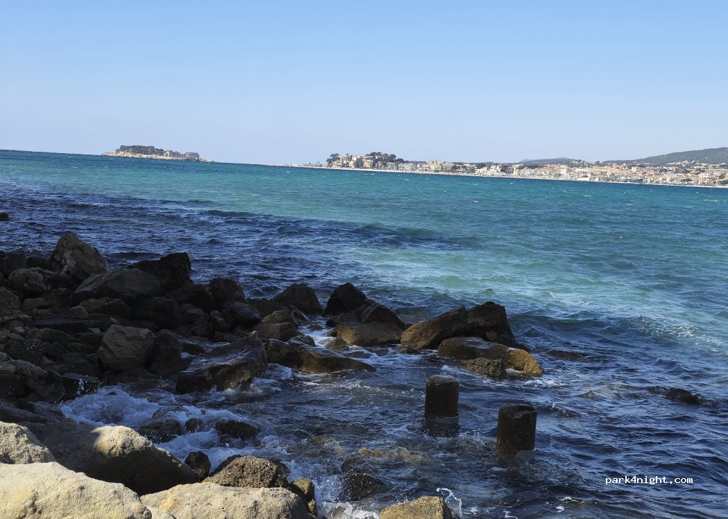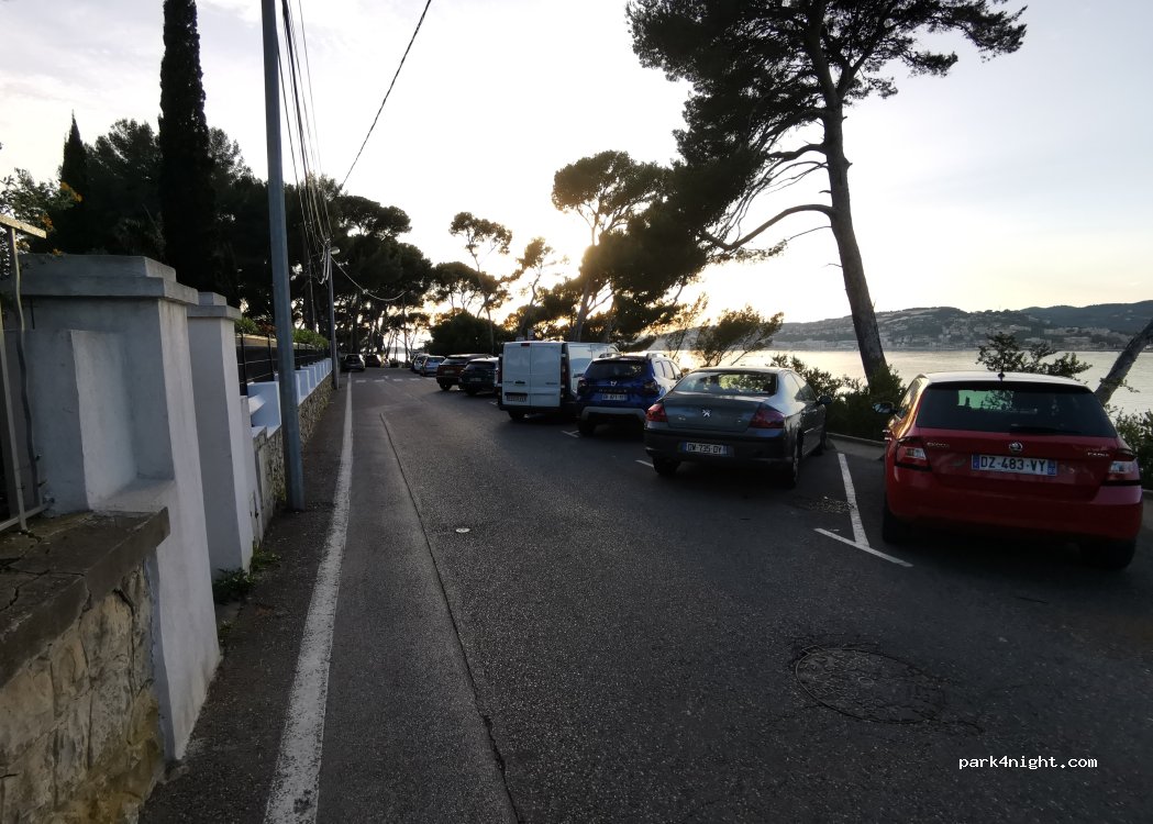 10-11 places de parking disponibles le long d'une route calme avec une belle vue sur la mer. Très calme néanmoins, hormis le passage du train au loin qui n'est pas vraiment bruyant ni dérangeant. Il y a des poubelles sur place.