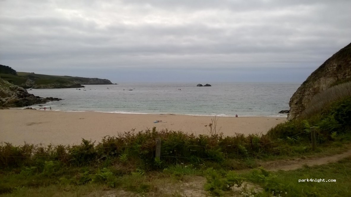 Parking d’une vingtaine de place de voitures, possibilité de garer des camping-cars, la plage une jolie petite crique. Il est juste en bas de la colline du camping Pors Peron, son propriétaire est anglais. Excellent site.