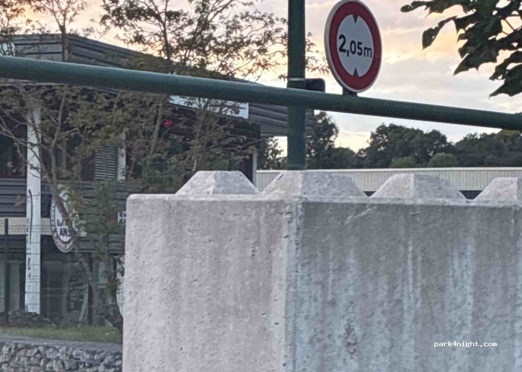Stellplatz-Zufahrt durch grossen Betonblock gesperrt; Stellplatz nicht mehr benützbar Öffentlicher Parkplatz nebenan mit Höhenbeschränkung, sowie mit CC-Verbotsschild.