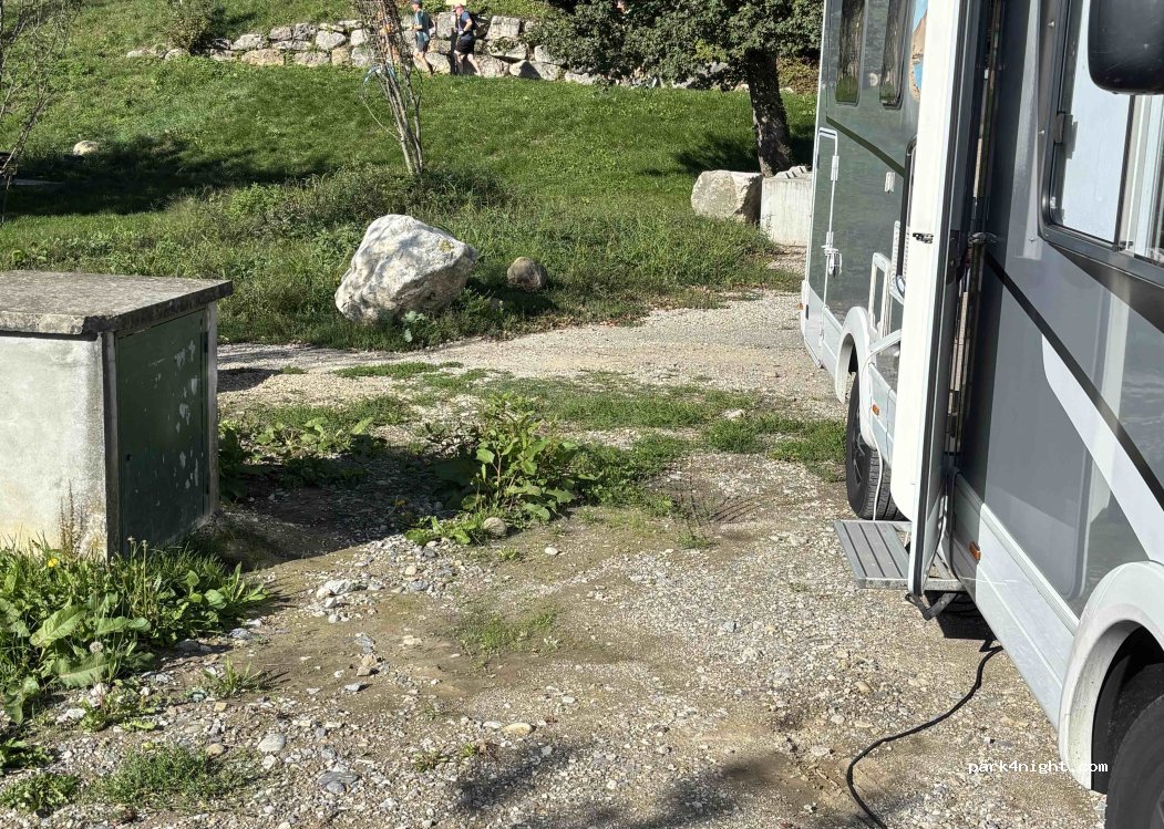 Merci à la mairie. Emplacement correct à l'ombre auprès d'un beau parc. Suivre la consigne pour payer. Aucun problème.