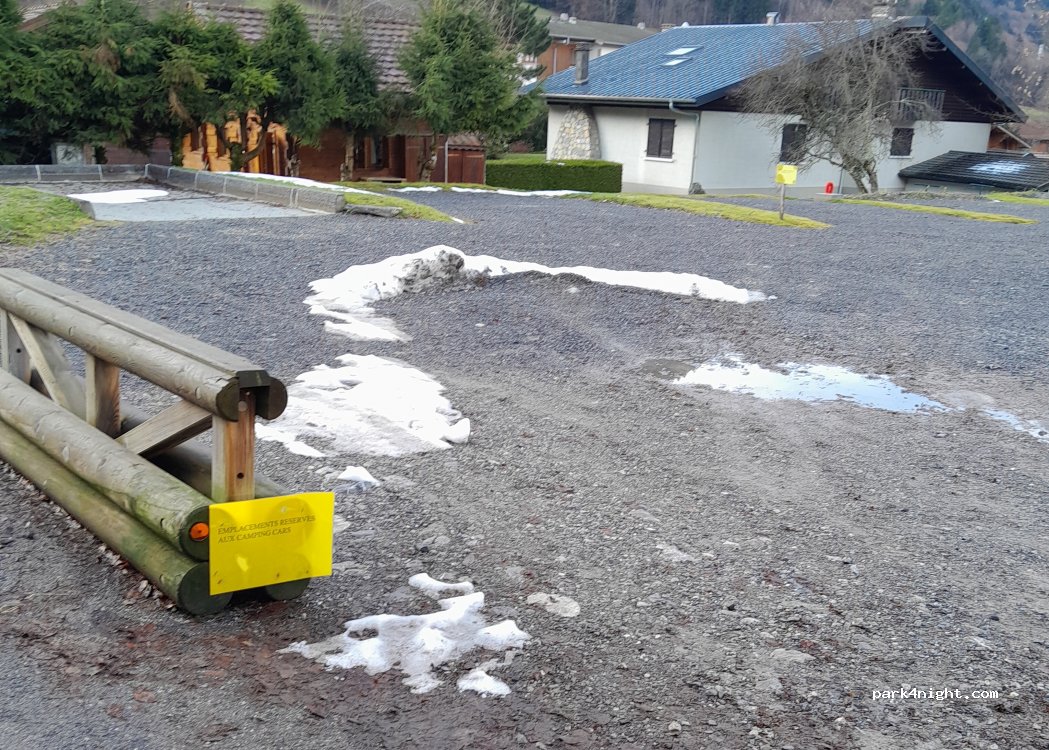 Terrain très tranquille, en terre battue, affiché "parking camping-cars "