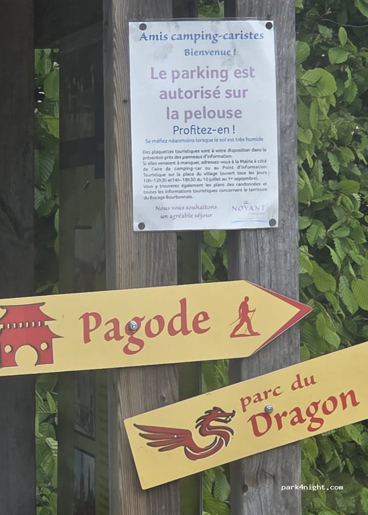 merci a la commune de noyant d allier.le parking est très bien situé et équipé. possible de ce mettre sur l herbe. non loin le musée miniature et mine .dommage pas encore ouvert . Reste la pagodes et très bon restau .Le pri d’asie .tout a pieds .