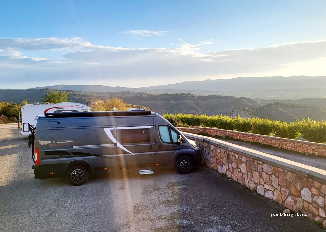 Grand parking. Tout proche du magnifique village d'alquezar à visiter absolument. La rando des passerelles est incroyable et accessible à tous. Par contre nuitée interdite sur le parking. Donc veuillez respecter sous peine d'être interdit partout aux camping-car