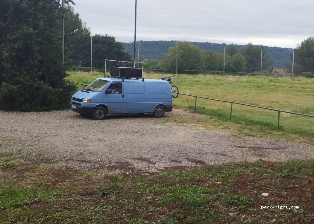 Parcheggio del campo da calcio, data la sua condizione, non ci gioca nessuno. Ai margini di una strada ma relativamente calmo questa domenica pomeriggio. Punto acqua e barbecue in loco. Dovrebbe passare la notte senza problemi.