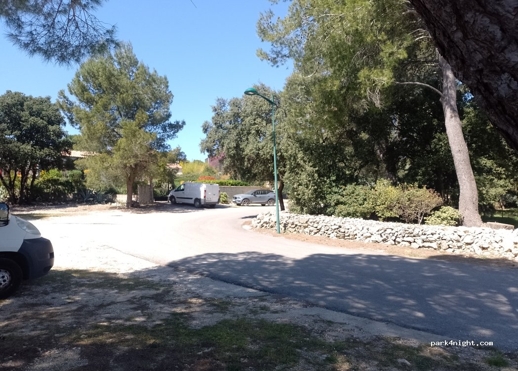 Parking du terrain foot, vu son état plus personne joue dessus. Au bord d'une route mais relativement calme en ce dimanche après midi. Point d'eau et barbecue sur place.