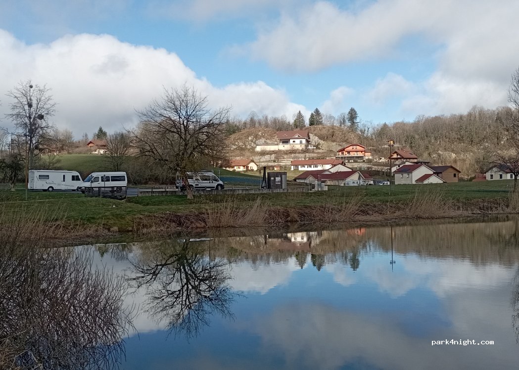 Parking pour 5 camping-cars. Calme malgré la proximité de la route et le son des cloches de l'église toute la nuit. Etang juste à côté.