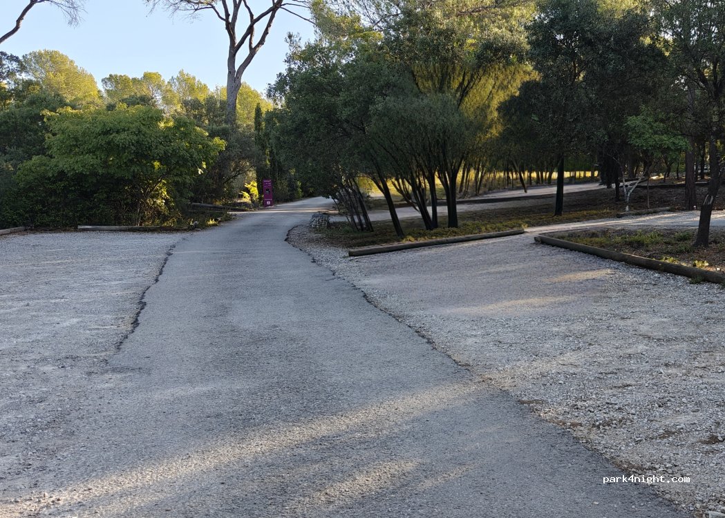 Parking gratuit du domaine de Restincliere à coté de Prades-le-Lez. Juste un endroit magique au calme avec des places type camping en gravier (quelques unes sont stabilisées).