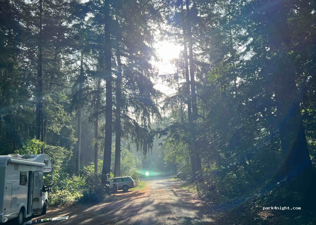 Sehr schöne Waldlage mit viele Vögel-Geräuschen (nicht zweideutig gemeint). Ruhig. Die Locals nutzen den Parkplatz zum Joggen, Biken & Co. Parkplatz ist am Ende einer Sackgasse - ankommende Autos sind wegen 30-iger Zone ziemlich leise. Anfahrt erfolgt über enge, lange, verkehrsberuhigte Straße vorbei an Premium Häusern. Die Parkplätze haben Länge von so 5,5m und sind für 6 Meter Camper ungeeignet