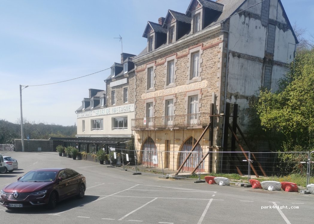 Un lugar para autocaravanas en el aparcamiento del Hôtel des Pierres Sonnantes y el restaurante Gilles de Bretagne. Gran vista de la bahía y el castillo. A pie de carretera y en pendiente pero de fácil acceso a los baños públicos, mencionado merendero en otro lugar y un pequeño sendero debajo. Estamos allí para comer.