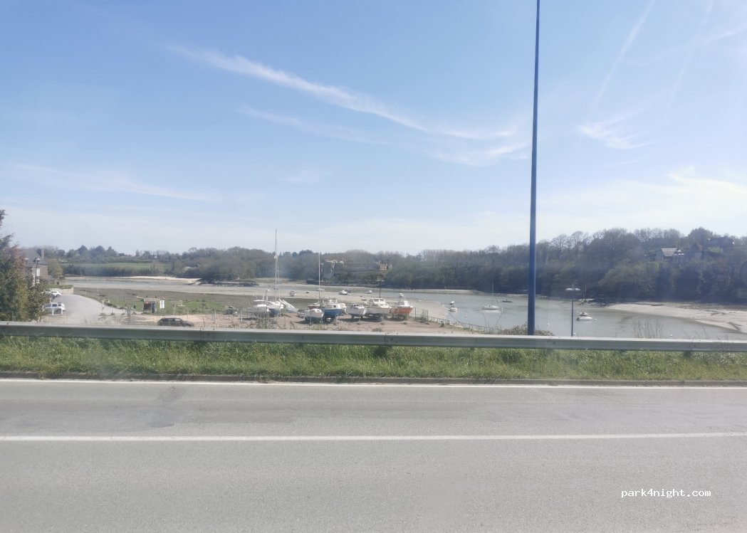 Un posto per i camper nel parcheggio dell'Hôtel des Pierres Sonnantes e nel ristorante Gilles de Bretagne. Ottima vista sulla baia e sul castello. Lungo la strada e in pendenza ma di facile accesso ai servizi igienici pubblici, area pic-nic menzionata in altro punto e un piccolo sentiero sottostante. Siamo lì per mangiare.