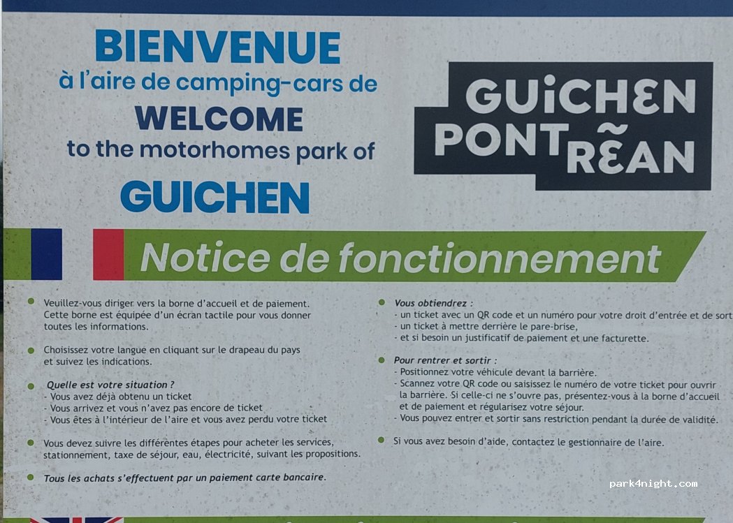 Contrairement à la remarque d’un utilisateur c’est bien une aire communale et payée par la ville de Guichen Pont-rean. Le système installé est bien celui de airpark mais l’investissement est bien communal. La gestion des paiements est déléguée à airpark mais les recettes vont bien à la ville qui gère et entretien l’aire.
