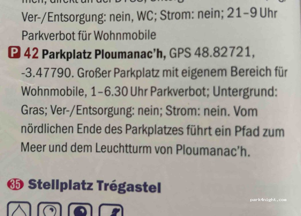 kein Wasser, kein Strom, enge Zufahrt und Übernachtung nicht erlaubt. Mitte Oktober wird nicht kontrolliert, ob übernachtet wurde. Sehr ruhig, Parzellen auf Wiese eines ehemaligen Sportplatzes. Beginn eines sehr schönen Wanderweges rund um das Cap mit den rosa Granitfelsen, die sehr sehenswert sind. Der kleine Ort Ploumanac'h ist schnell erreicht.