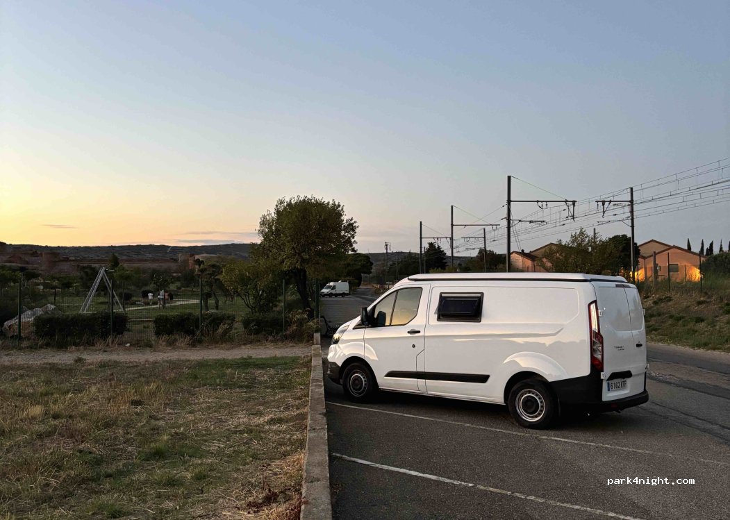 Nuestra idea era dormir en el pinar cercano a la fortaleza de Salses pero terminamos aquí porque había mucho viento y se estaba más resguardado. El tren pasa cerca pero por las noches es muy tranquilo, cerca de un parque infantil, con papeleras cerca y bonitas vistas.