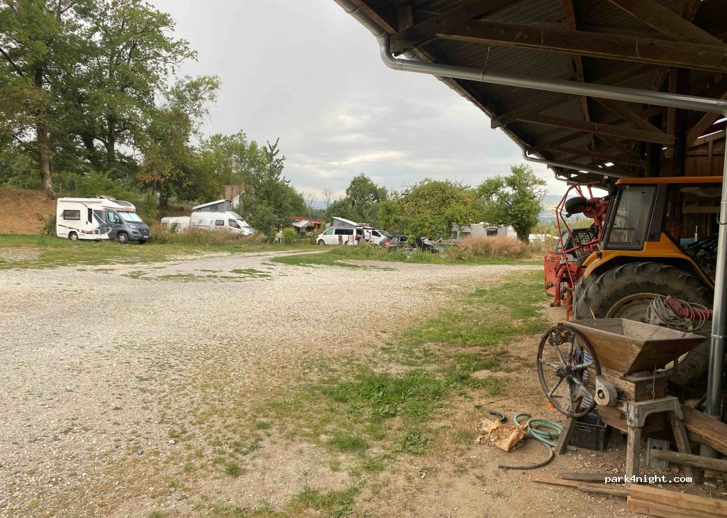 Séjour 1 nuit en toute simplicité. Jolie vue sur village / montagnes. Sanitaires propres/spacieux. On entend les poules par la fenêtre en se douchant ;) Notre CC, cause fortes pluies récentes, s'est enlisé en repartant : réaction immédiate du propriétaire -> intervention en tracteur et le tour était joué ! et ça fait des souvenirs ! Petit bémol, pas de vidange eaux grises / noires possible.