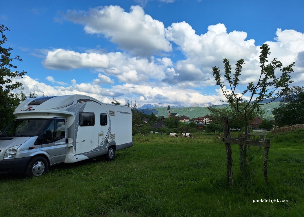It’s a beautiful place on a farm. There are no parcels so you can choose wherever you want to stay. Bathrooms are very clean. It’s about 10 km from Annecy. 2 restaurants nearby. Entering with bigger caravan isn’t easy but possible. Very good price.