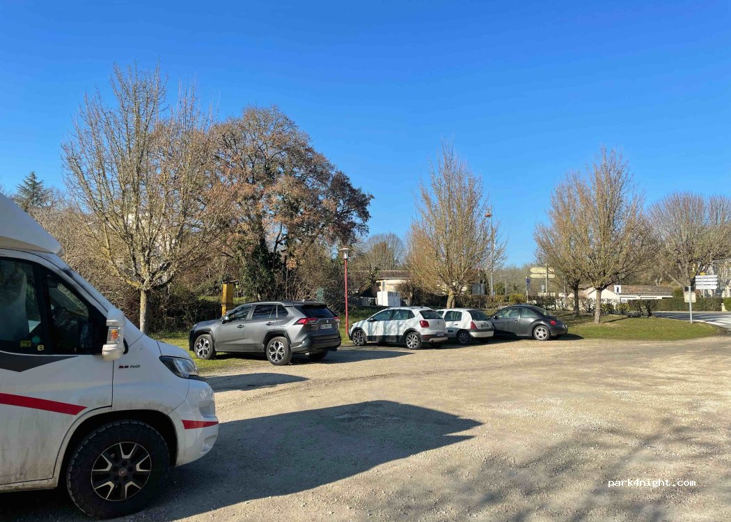 Kann man beruhigt parken und übernachten, beleuchtet und geschottert, Müll auf der anderen Straßenseite. Versorgung fußläufig erreichbar, Samstags kleiner Markt.Carrefour Contact mit Tankstelle und Waschmaschinen im Ort.