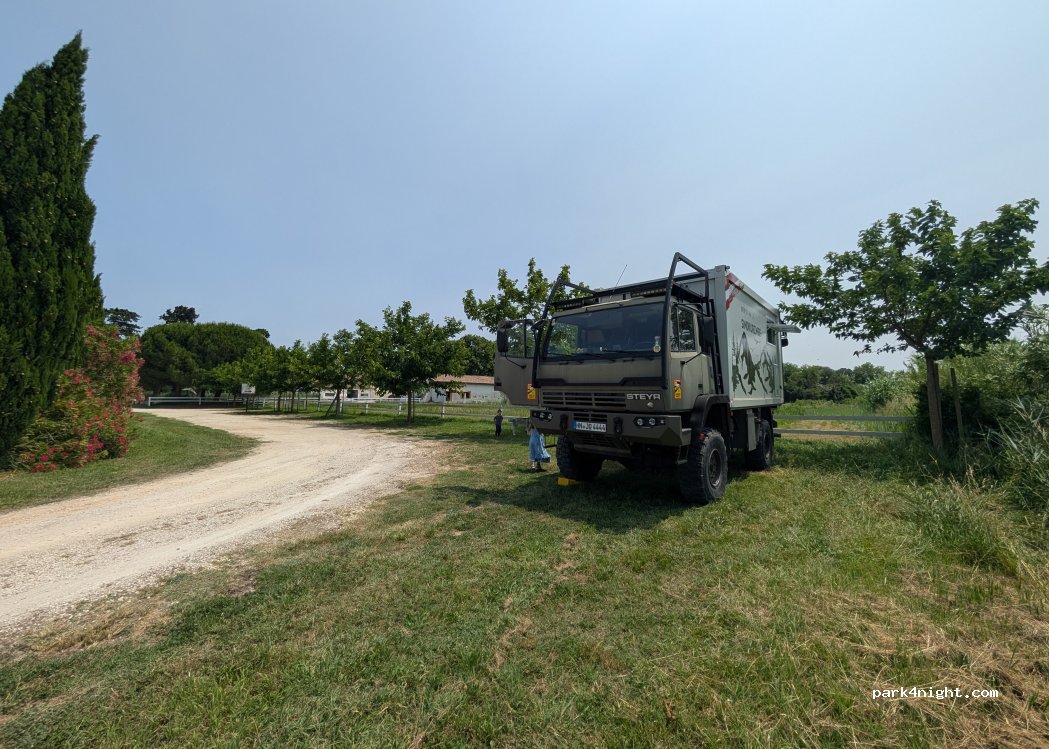 Ein wunderschöner Platz mit wenigen Parkbuchten zwischen Bäumen. Kostenlos, Picknicktisch vorhanden. Blick auf Pferde und weit übers Land. Sehr idyllisch!!! Ein top Tipp! Es war ein spontaner Entschluss auf dem Weg nach Aigues-Mortes, hier zu übernachten. Und ich bin sicher, das war die viel besssere Wahl als der offizielle Stellplatz in Aigues Mortes!