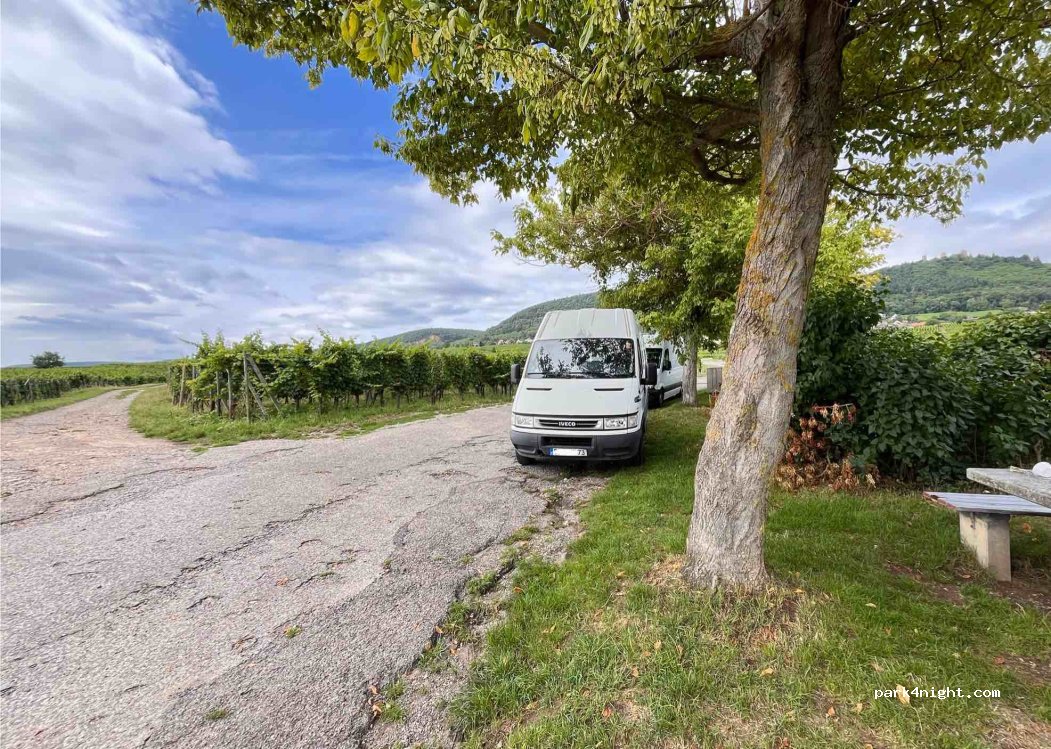 Very nice and quiet spot among vineyards, located between two villages. We spent one night here in January, and apart from the vineyard workers, we were completely alone. In the morning, we visited the village of Eguisheim, which is charming, and we tasted some pastries from the local bakery. We highly recommend both the village and this parking spot.