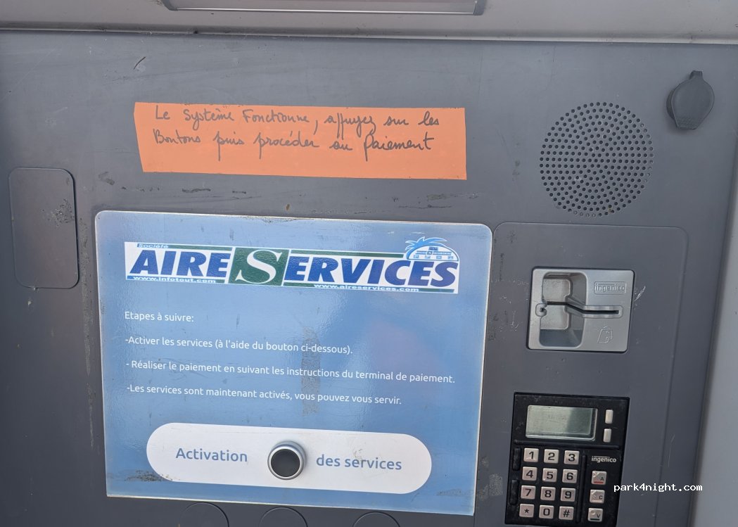 Tous les services au milieu de rien fonctionne très bien insérer la carte bleue avant de faire quoique ce soit. Quatre euros pour tous les services je trouve cela correct sur une borne neuve. Merci la commune