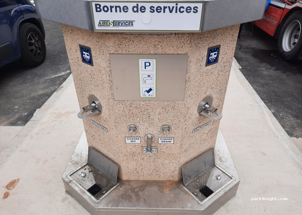 Facile d’accès depuis les 2 côtés de l’autoroute et depuis parking camions ou voitures. Vidange et WC ok mais malheureusement pas d’eau en ce mois de décembre malgré des températures douces.