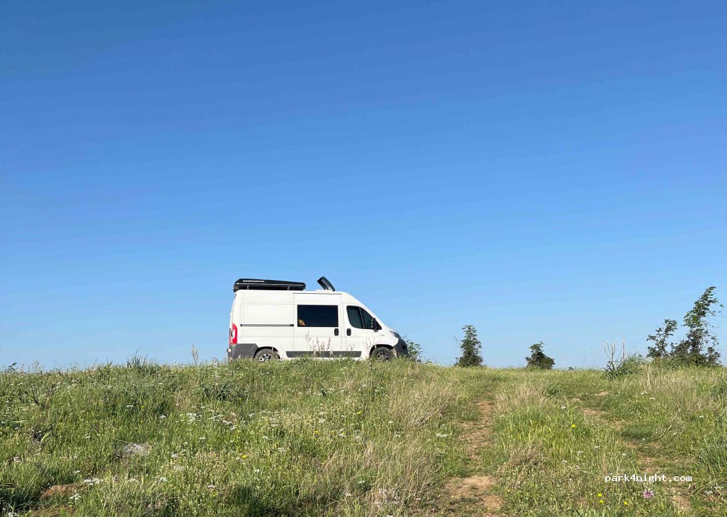 Oben auf dem Plato mit sehr guter Weitsicht und fast gerade. Mit Bulli oder Kastenwagen je nach Bereifung und offroad Erfahrung recht gut zu erreichen. 4x4 nicht zwingend nötig. Die Zufahrt ist ein Wiesen und Schotterweg. Sehr ruhig.