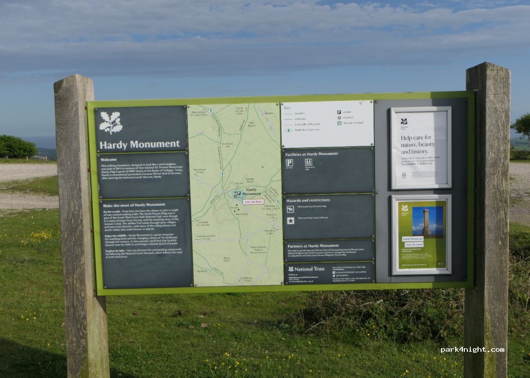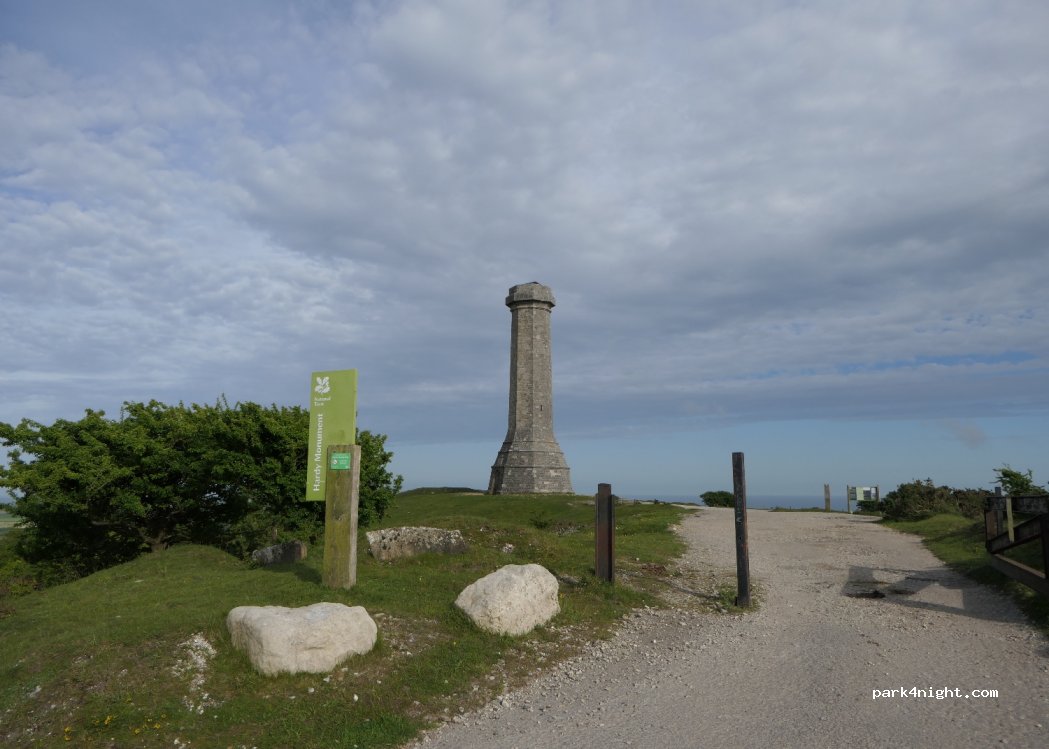 Ich habe mir den Platz angesehen. Es ist ein Platz rund um das Hardymonument welches vom National Trust verwaltet wird. Auf der Infotafel gibt es keine Beschränkungen. Das Zufahrtstor hat eine Durchfahrtsbreite von 2,4 m breit. Obwohl der Ausblick sehr schön zum Meer ist würde ich da nicht übernachten.