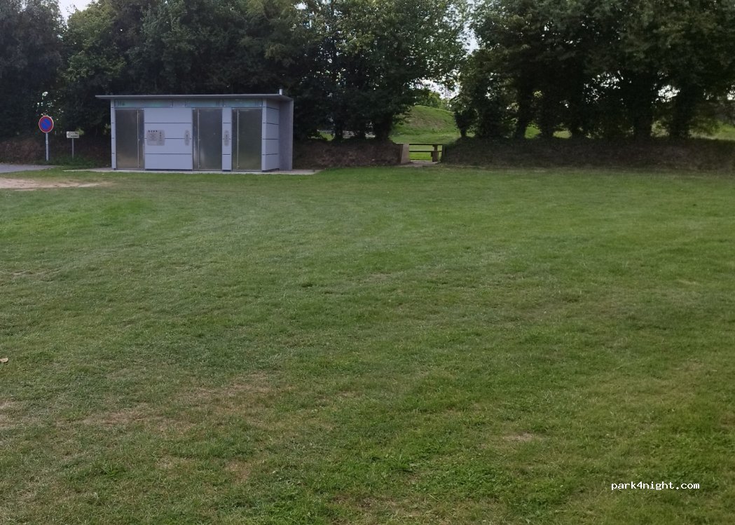 This is a secluded, serene spot to spend a night before visiting the attached Azeville Batterie. The toilets are 24h and in good condition. Nobody said I could not stay overnight, nor are there any signs, plus the out-of-order electrical hook up and water fill indicates campers are (somewhat) welcome! Park on the grass to avoid taking a car space and drive carefully, as roads nearby are narrow.