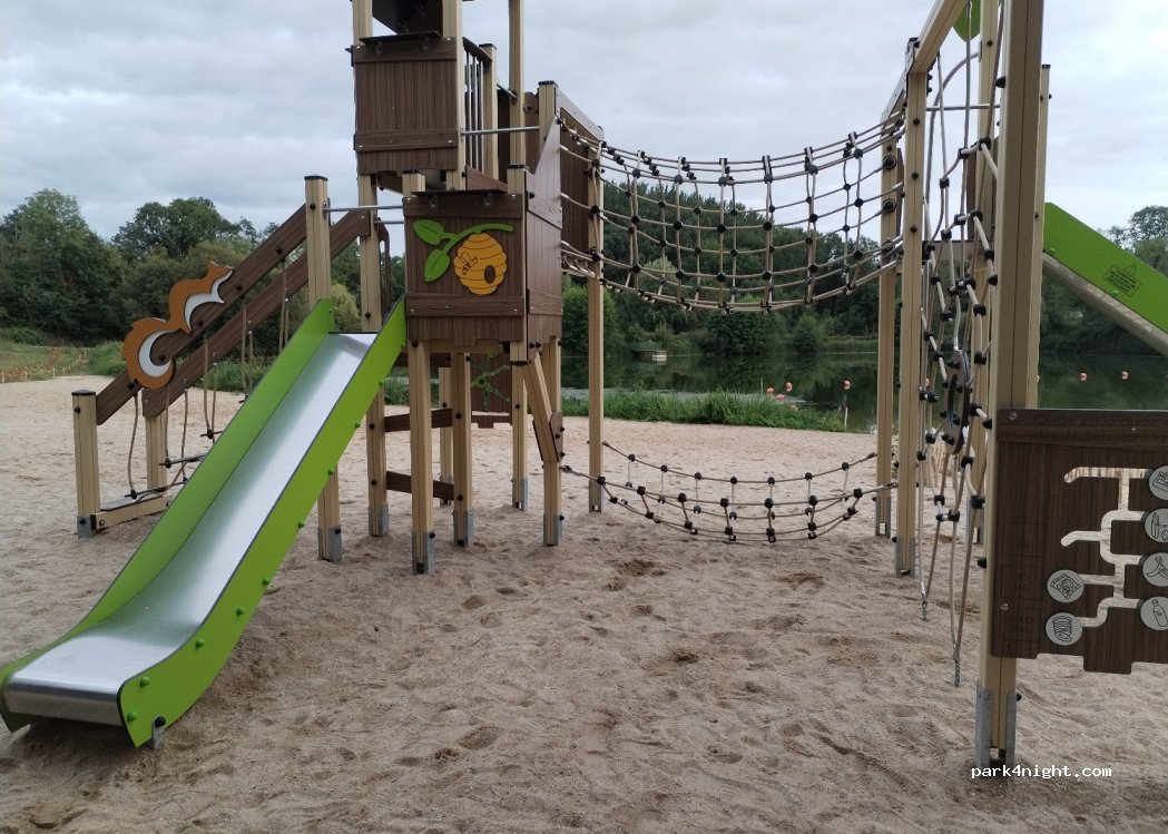 Parking lot of the body of water. Slightly sloping but huge. Located at the edge of the lake. Multiple activities: tree climbing, wakeboarding, water skiing, children's play area. Restoration point in July August. In addition, the municipal campsite is next door with services.