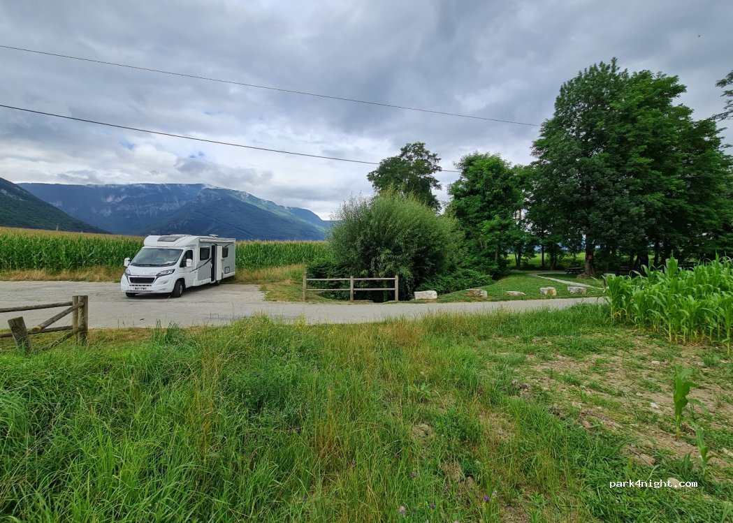 Nous voulions nous arrêter à Nantua mais plus rien pour les caming car. Et nous nous trouvons sur ce petit parking au milieu des champs avec une belle vue à 360°. un tracteur de temps en temps et les avions ne sont pas vraiment une nuisance sonore. Parfait pour se poser même pour une nuit.