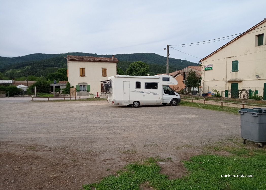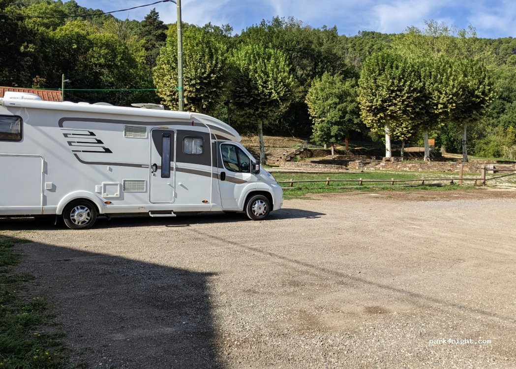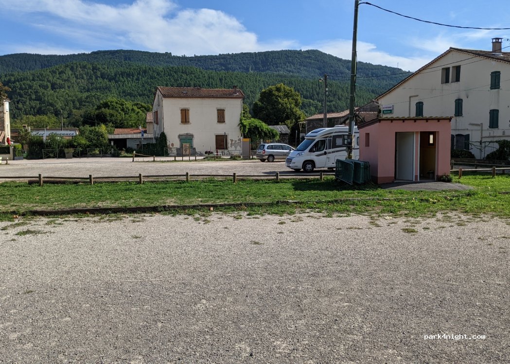 Parking au calme avec WC situé face à un restaurant près du centre du village. Boulangerie sur la place de la mairie (un bon pain à la châtaigne et figues) bar et restaurants ainsi qu'une épicerie et une boucherie. il y a aussi des WC avec lavabos très propres situé à l'arrière de la place de la mairie en face de l'école. Parc avec jeux pour enfants Merci à la ville pour tous ces équipements.