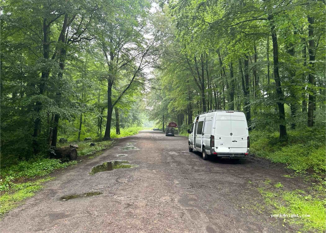 Parking en forêt, non loin de la route principale mais on n'entends pas les voitures. Au calme la nuit. Quelques joggeurs ou promeneurs le matin et le soir. Bien pour une nuit.
