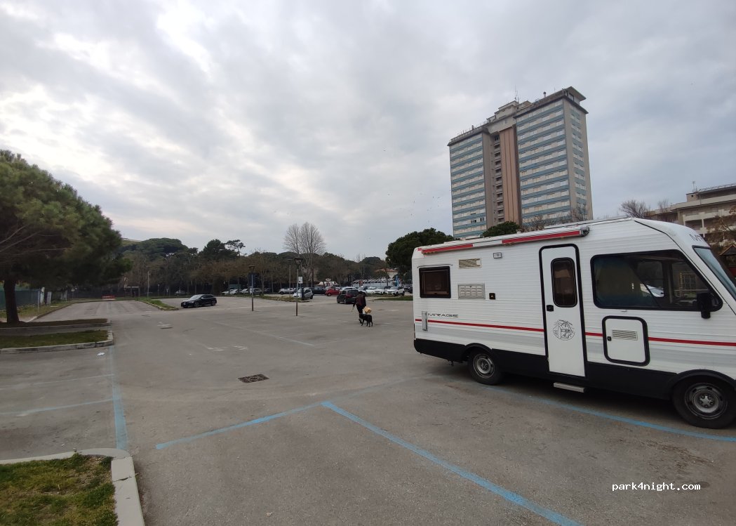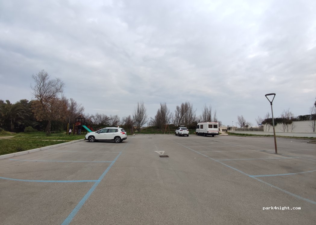 grandioso parcheggio, nessun divieto per i camper, confermato dalla polizia locale, dentro gli spazi sosta consentita per più giorni. silenzioso la notte, due passi dal mare e 100 metti dal centro. piccolo parco giochi adiacente. ci sono anche i bagni a pagamento. consigliatissimo