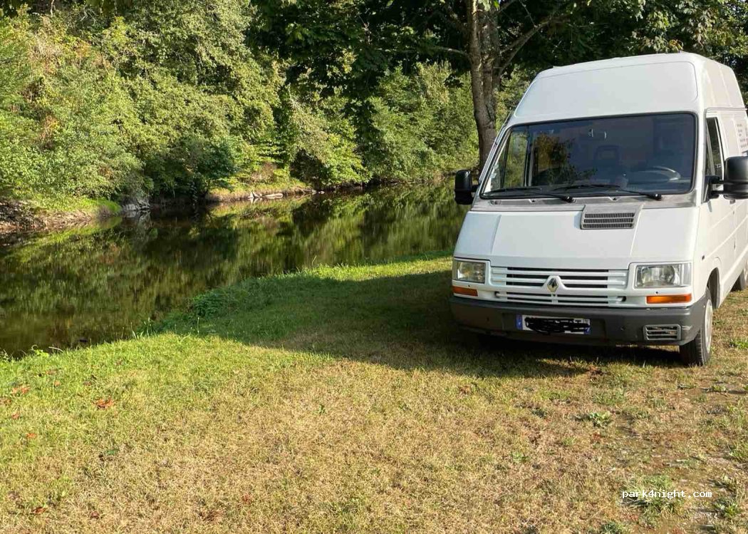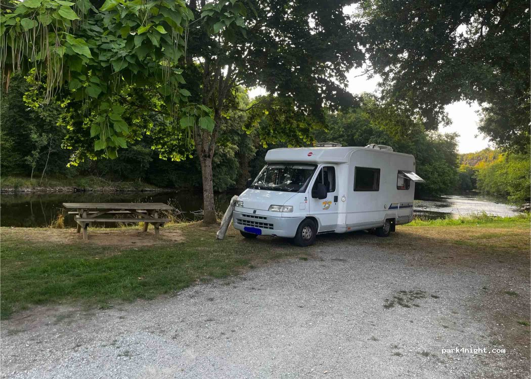 Spot large et accessible en camping car. Juste avant l’entrée d’un camping nature en bord de rivière. Table pique nique. Plat. Nous étions 3 cc éloignés de bien 20 m chacun ! Autant dire que c’était calme. Aucun bruit. Bonus une table de ping pong à côté avec une balançoire :) village à découvrir ❤️