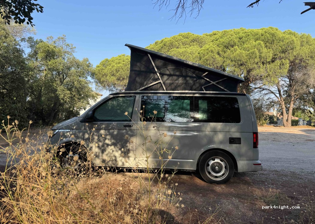 Une nuit au calme passée avec 3 autres vans sur ce petit spot. Espace ombragé sous les pins permettant une nuit rallongée. Donne sur un parc, idéal pour promener son chien et se balader avant de repartir.