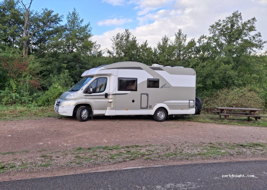 Small car park in front of a pond, with table and picnic bench. The road is quiet, not disturbing. Restaurant at the exit of the city, simple and hearty cuisine.