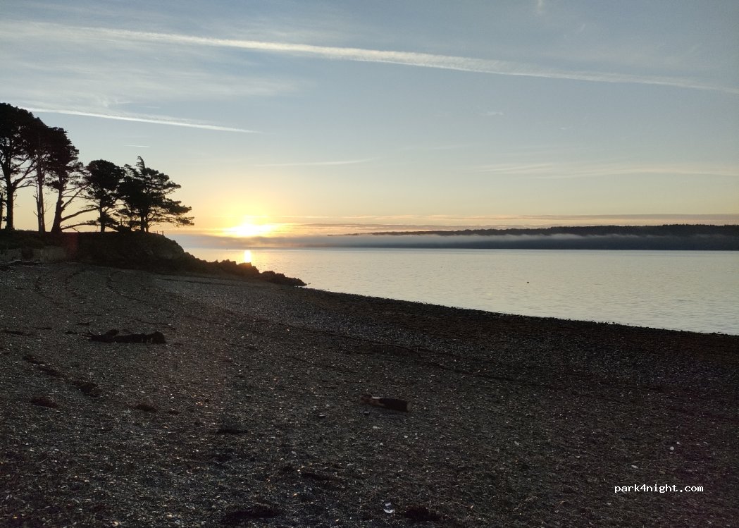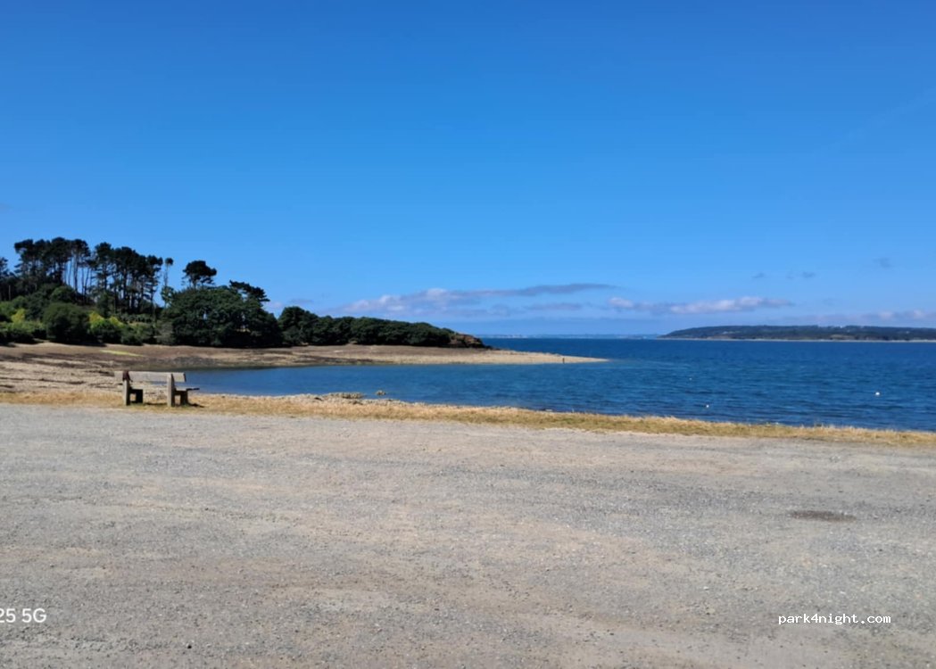 Terrain en herbe à côté de la route mais aucun bruit la nuit. Nous étions 4, plage de petits galets juste en dessous avec un vendeur de crêpes et boissons. Une belle halte sur notre parcours