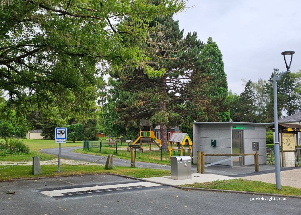 excellent emplacement, que je recommande avec une borne de vidange, un point d’eau potable, des toilettes publiques, ainsi que des tables de pique-nique et une aire de jeux. de plus la poste de police à proximité, nous a permis une nuit en toute tranquillité