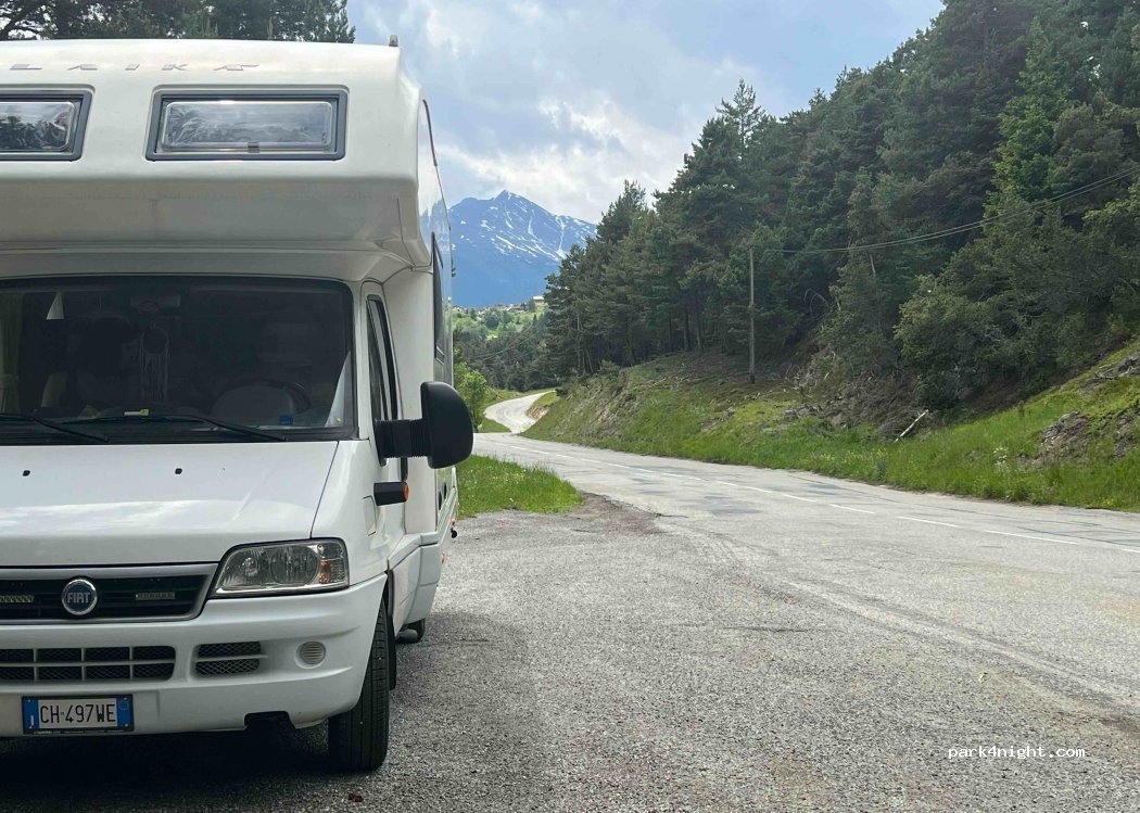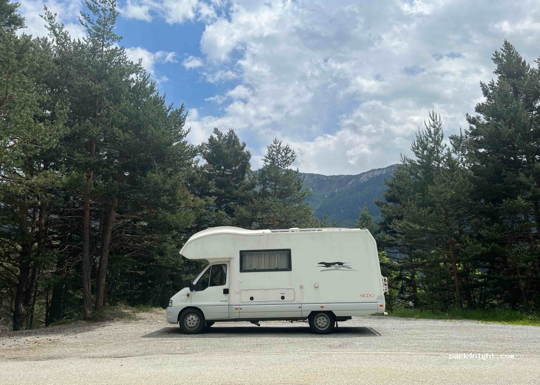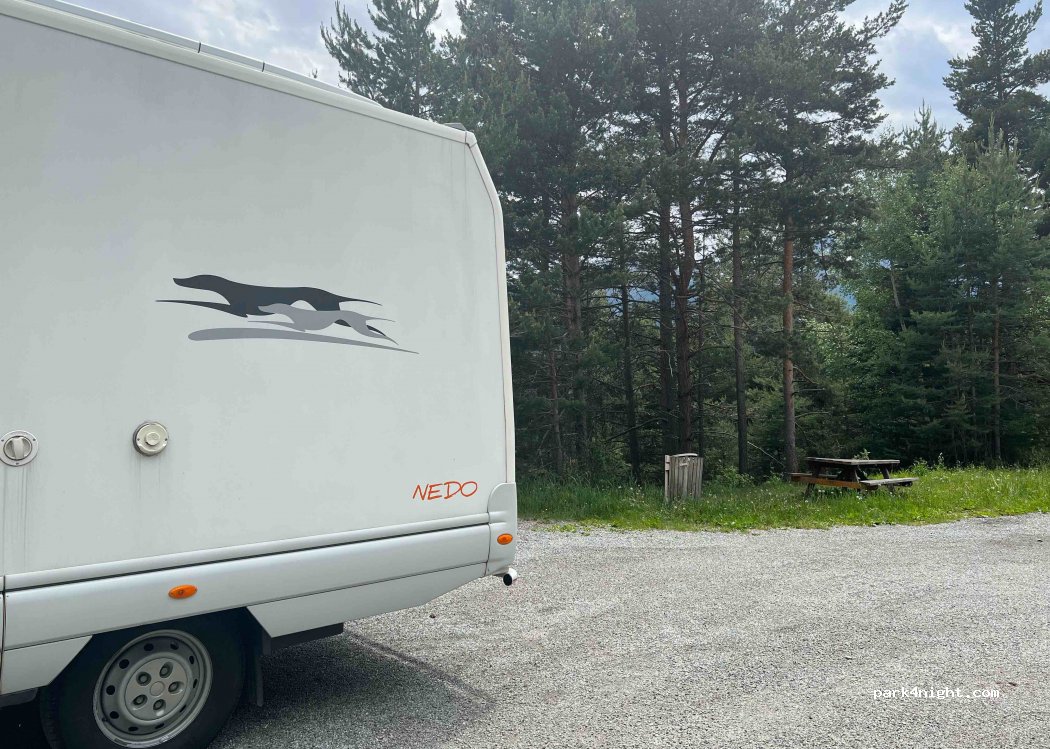 Niente più che un parcheggio a bordo strada, molto poco trafficata. A bordo di un bosco. Tavolo da picnic e cestino dei rifiuti. Dall’altro lato della strada parte un percorso per escursioni a piedi o in MTB. Terreno in ghiaia, abbastanza in piano. Posto per massimo 2 camper. Nessun servizio, ma tranquillità assicurata.