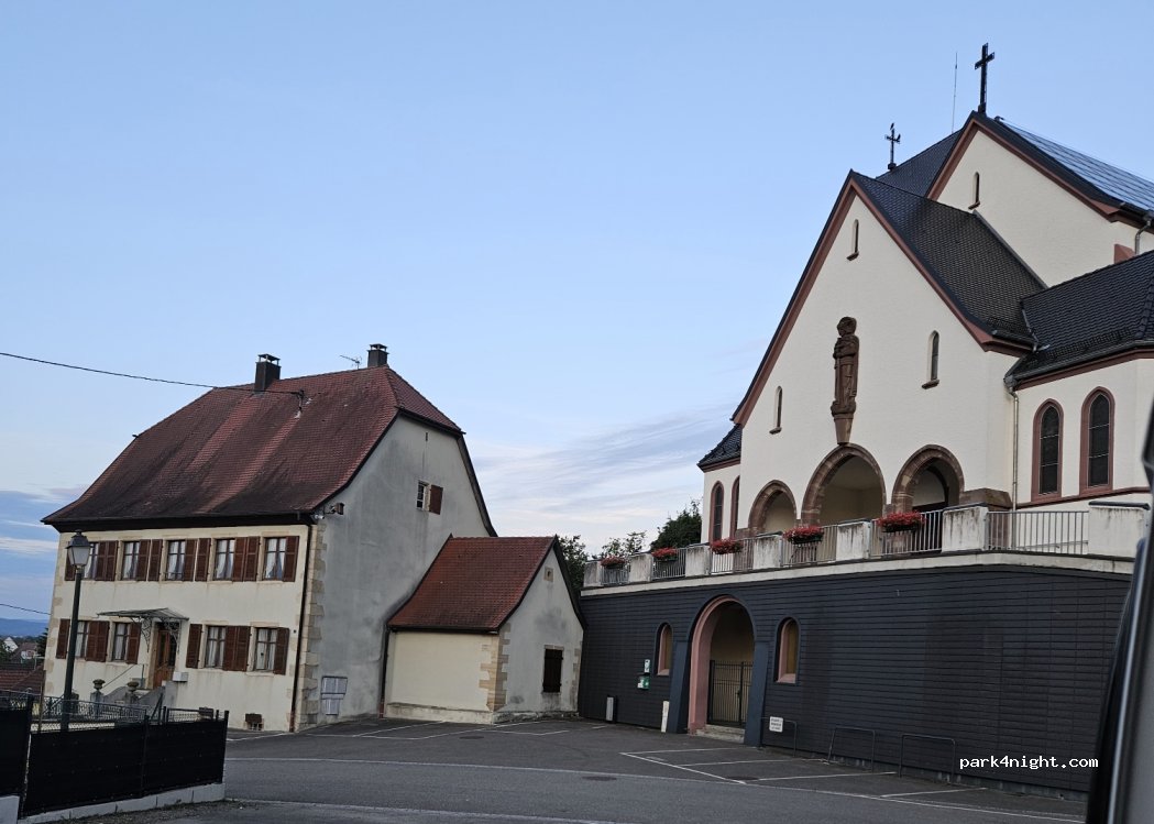 Parkplatz direkt neben der Kirche. Achtung! Zufahrt über den zweiten Kreisel nehmen. Für eine Nacht okay.
